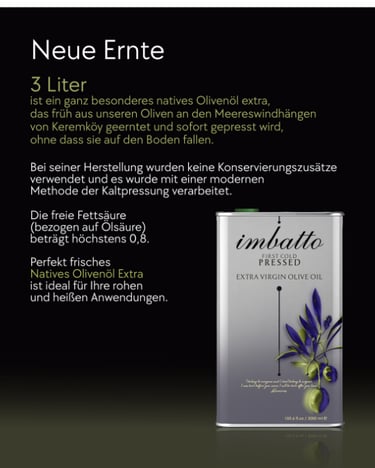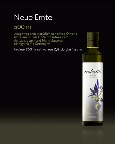 Imbatto stammt aus Gömeç Keremköy (Balıkesir), einer der renommiertesten Olivenregionen der Türkei. Die Oliven werden von Hand geerntet, vor Sonnenaufgang, nicht der Hitze ausgesetzt und innerhalb kürzester Zeit kaltgepresst – genau wie im PDF beschrieben.