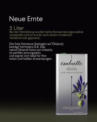 Viele Öle sind gestreckt, oxidiert oder industriell verarbeitet. Imbatto ist 100 % naturrein, ohne Zusätze, ohne Mischungen.